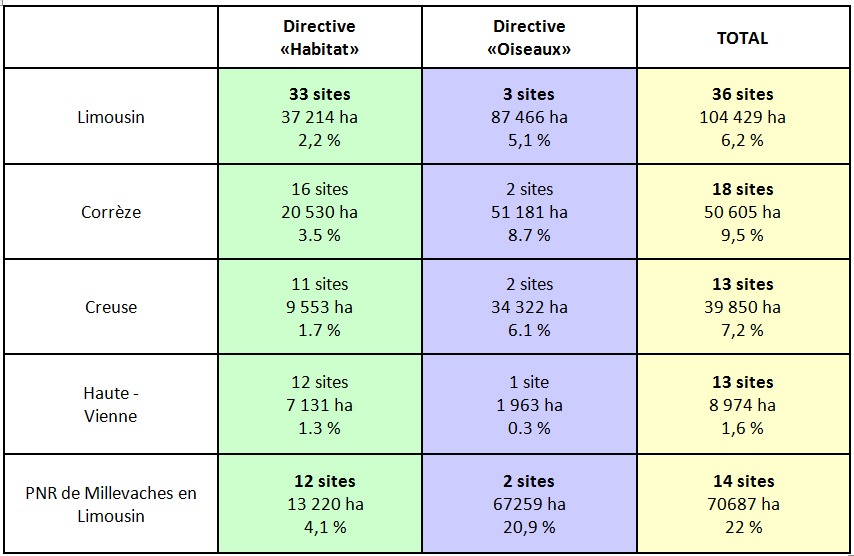 Le réseau de sites Natura 2000 représente environ 6,2 % du territoire du Limousin répartit comme suit :